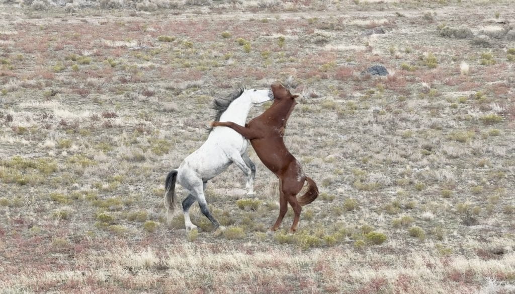 And we see something that directly contradicts this idea: band stallions often interact peacefully with youngsters from other bands. They tolerate them, play with them, and allow them to be close. Just like band stallion Reece playing here with 10-month-old Fox from a different band: