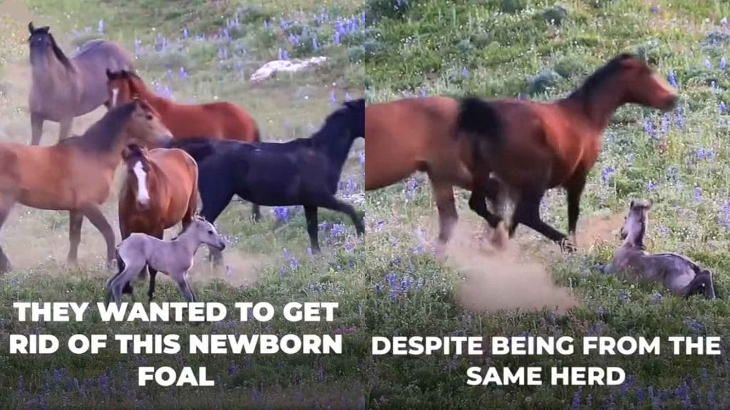 The reason given for why the “own band” attacked the foal is that it smelled strange and therefore was not accepted by the others. Then other clips – which are not related to the initial scene – are added and more dramatic explanations are layered on top.