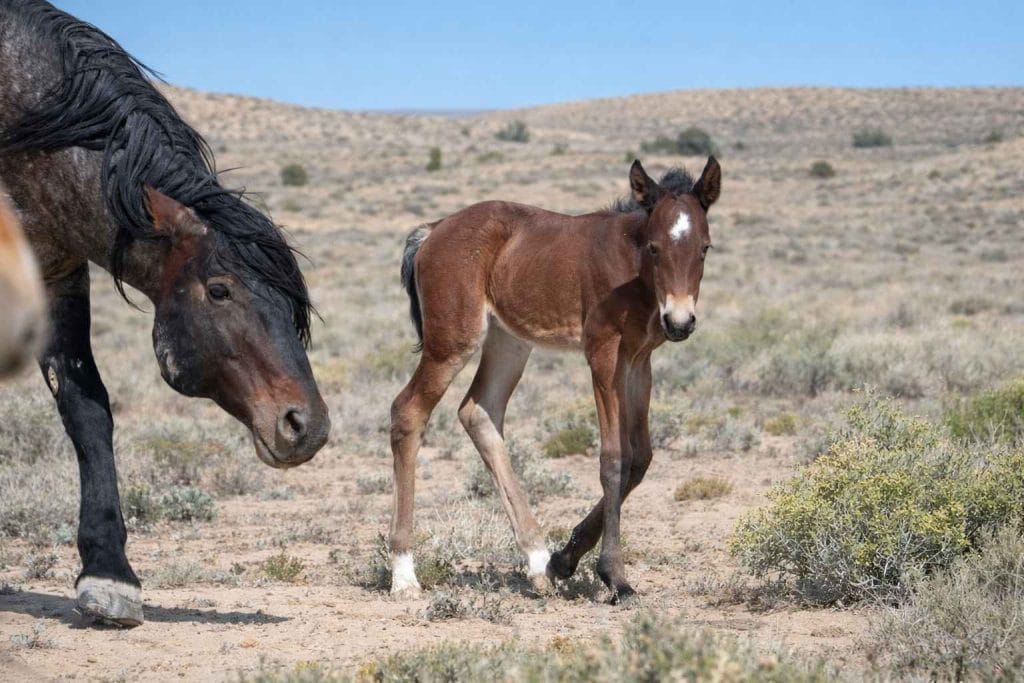 At the same time, what we rarely see documented are the countless calm interactions: stallions standing guard while foals rest or positioning themselves between foals and danger. We also see them allowing foals from other bands to graze nearby, like band stallion Moondrinker here with a foal that belongs to a different band, Sunstar’s: