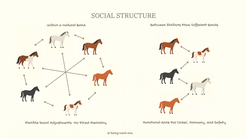 Wild horses show us flexibility and adjustment within the band. Between bands, stallions show functional rank when coordination and safety require it. And domestic horses show us just how adaptable they are, even when the system makes things difficult.
