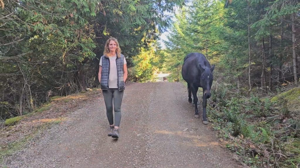 Today, when we go for a walk on our own larger property, I often don’t use a lead rope. I use what I’ve come to think of as a ‘wild-horse-style’ invitation– a particular quality of ‘let’s go’ in my posture and direction – and she joins me about 95% of the time.
